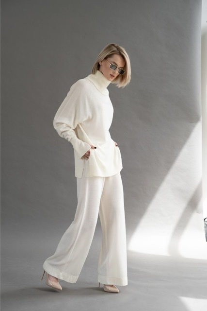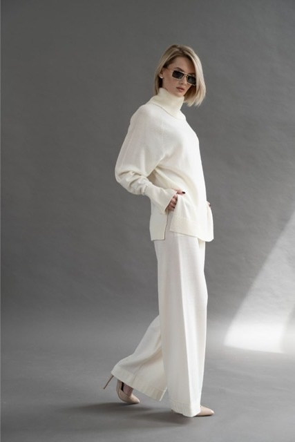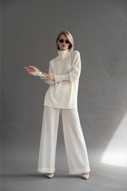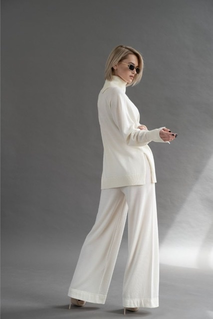 100% fine merino wool suit. Palazzo pants, high waisted and 2 side pockets. The tunic is seamless and tailored with slits on the sides.