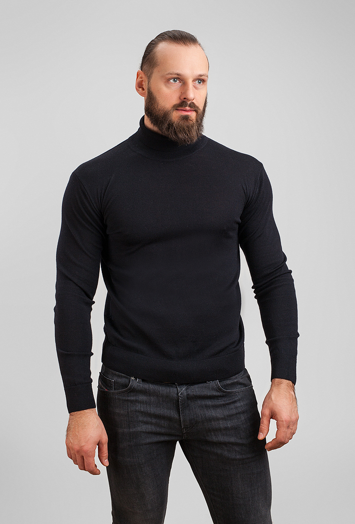 Men's Viamaro turtleneck with a straight silhouette, long sleeves and a high collar. The original cut looks stylish. The sleeves and bottom are knitted with elastic, which holds its shape perfectly. The high collar reliably protects from cold and wind in cool weather. The golf is knitted from 100% extra fine merino wool, so it is soft, warm, and pleasant to the touch.