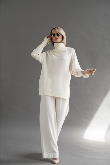 100% fine merino wool suit. Palazzo pants, high waisted and 2 side pockets. The tunic is seamless and tailored with slits on the sides.